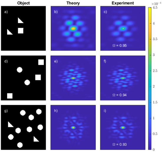 Examples of the collected diffraction pattern intensities experimentally measured [)] are shown in Figure 3 and compared with the corresponding theoretical predictions [)], generated using a far field FFT-based algorithm that describes the scattering process. Here designates the transverse coordinate on the measuring plane. To evaluate the degree of similarity between experiment and theory, we make use of the overlap parameter [46]