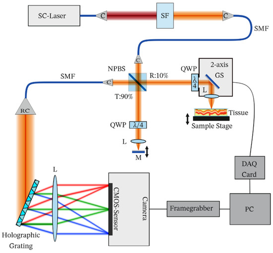 Our proposed CP-OCT system is shown in Figure 1. Light from a broadband supercontinuum laser (SC-OEM, YSL Photonics, Wuhan, China) was filtered using a short-pass dichroic mirror (SF, DMSP950T, Thorlabs, Newton, NJ, USA) and wavelengths below 950 nm were coupled to a single-mode fiber (SMF, SM600, Thorlabs Newton, NJ, USA). The laser was operated at 200 MHz, at which it provided a spectrum centered at 885 nm and a full width at half maximum of 80 nm at the spectrometer. Light from the single-mode fiber was collimated using a collimator (C, F230APC, Thorlabs, Newton, NJ, USA). A 90/10 beam splitter (NPBS, BS025, Thorlabs, Newton, NJ, USA) was used to split the light into a reference path and a sample path. Ten percent of the input light (15 mW) was used to illuminate the sample and 90 percent of the input light was used to illuminate the reference mirror.