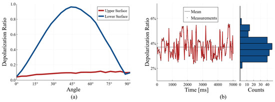 It can be seen from Figure 2a that the depolarization ratio of the signal from the top surface of the QWP is approximately constant, whereas it changes with the rotational angle for the light reflected from the lower surface of the QWP.