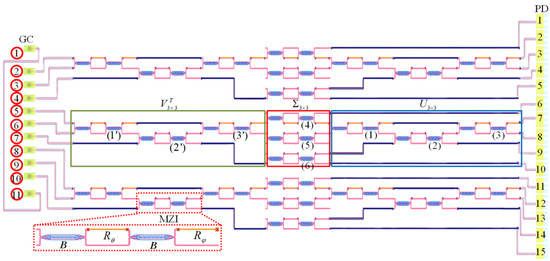Illustration of three 3 × 3 MZI-based reconfigurable linear optical processors with nine input (GC 2 to 10) and fifteen output ports (PD 1 to 15). The SU (3) consists of MZIs labeled 1 to 3 (or 1′ to 3′). The section of the 3 × 3 structure comprises MZIs labeled 4 to 6.