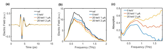 (a) Reflected time domain signal, (b) THz spectrum and (c) Absorption of graphene metamaterials from 0 to 2 μA at 20 keV electron beam.