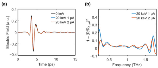 (a) Time domain signal of 0~2 μA for SiO2/Si substrate at 20 keV. (b) Normalized spectra of 1 μA and 2 μA to 0 μA.