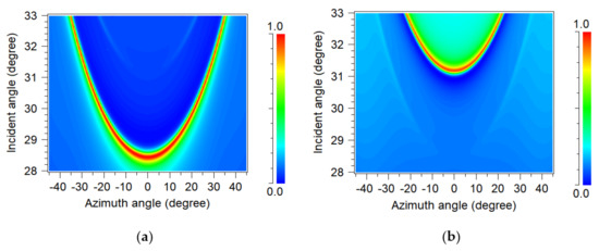 In the simulations, the refractive indices (RIs) of the glass substrate, UV glue grating, and AZO film were ns = 1.515, ng = 1.475, and nAZO = 1.79, respectively. The grating period Λ was 555 nm, corresponding to a commercially available holographic grating with 1800 lines/mm, and the modulation depth of the UV glue grating was 75 nm, based on an atomic force microscope (AFM) measurement result. An AZO film with a thickness of 275 nm was used as a high-RI waveguide and air (n = 1.0) was used as the superstrate. A He-Ne laser with a wavelength of 632.8nm was incident on the substrate at an angle of θ, and the effect of the change in incident angle on the zero-order reflection was first analyzed for both p- and s-polarization. The reflectance maps of the GMR device are shown in Figure 2. The dark blue area represents regions with low reflectivity, whereas the red area represents regions with high reflectivity. The azimuth angle varies from −45° to 45° for selected incident angles ranging from 28° to 33°. Figure 2a,b illustrate the reflectivity maps of the GMR device for p- and s-polarized light, respectively. When the incident angle was in the range 28°–31°, only p-polarization exhibited resonance, whereas s-polarization could be used as a reference in the heterodyne interferometer. In this experiment, the incident angle was set between 28° and 31°, and then the azimuth angle was rotated to obtain the phase difference between p- and s-polarization. In addition, the reflectance pattern in Figure 2a can also be found in Figure 2b with a weak reflectance and vice versa. This reveals a coupling between the TE and TM modes of the grating waveguide.