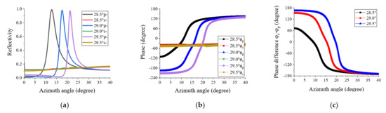 Plots of the reflectivity versus the azimuth angle for three different incident angles, 29.5°, 30.0°, and 30.5°, are shown in Figure 3a. As the incident angle increased, the resonant azimuth angle also increased, and the resonant angle width decreased, as shown in Figure 2. Weak resonances were observed for s-polarization. The phase response of the reflected light versus the azimuth angle for different incident angles is shown in Figure 3b. The p-polarization phase curves changed dramatically, corresponding to the resonance peak shown in Figure 2a. On the other hand, the s-polarization phase curves exhibited only small changes and could be used as a reference in the heterodyne interferometer. Plots of the phase differences between the s- and p-polarization components are shown in Figure 3c.