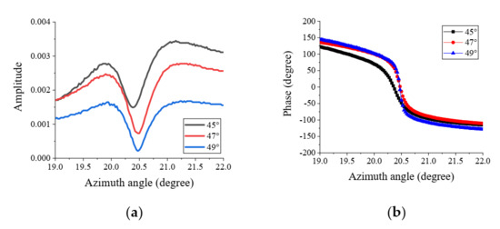 In the second experiment, the GMR device was used as a gas sensor. Before performing the sensing measurement, tunable reflected phase-detection sensitivity was demonstrated. In the EO heterodyne interferometer, the phase-detection sensitivity can be tuned by rotating the analyzer. In this experiment, the incident angle was set at 31.7°, and the measurement results of the lock-in amplitude and phase curves versus the azimuth angle for three analyzer angles (45°, 47°, and 49°) are shown in Figure 6a,b, respectively. This reveals that, near the resonance angle, the phase slope increases when the lock-in amplitude decreases. Rotating the analyzer can tune the passing-through light amplitude ratio between s- and p-polarization components, and hence change the interference of light modulation intensity on the photodetector. A small lock-in amplitude reading means less modulation of the light intensity. The decrease in modulation can enhance phase change; however, the modulation strength cannot be tuned too small and must satisfy an acceptable signal-to-noise ratio (SNR). Consequently, the analyzer was set to 49° to obtain an acceptable SNR; this obtained the steepest slope on the phase curve, and hence the highest sensitivity. According to the results in Figure 6b, the azimuth angle was rotated to 20.45° in the EO heterodyne interferometer.