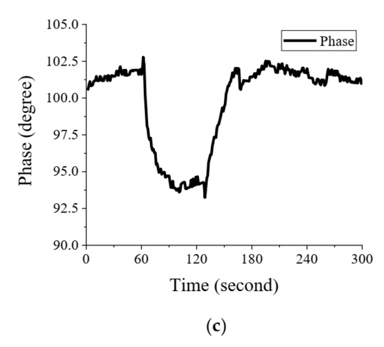 Subsequently, a helium (He) gas was injected into the chamber to replace the air on the GMR sensor surface. The RIs of air and helium are approximately 1.000276 (for dry air at 15 °C and 101,325 Pa with 450 ppm CO2 content) and 1.000035, respectively, at a wavelength of 680 nm [12]. The time evolution results of the phase curve are shown in Figure 6c. In this experiment, He gas was continuously injected from t = 60 to 120 s. The measured phase decreased at the moment of injection because of the decrease in RI on the GMR sensor surface. The phase then increased as the He gas leaked out. Because this system did not maintain the same temperature in the chamber during the measurement, some small variations in the resulting curve were observed. The phase change during the He injection was approximately 9°, and the RI change Δn = 2.41 × 10−4 RIU. Consequently, in this measurement, the proposed system achieved a detection sensitivity of 3.73 × 104 deg./RIU. The fluctuation of phase may be caused by thermal and environment noise. However, this value may be further improved by increasing the time constant of the lock-in amplifier. This may require more time to complete the measurement. Assuming that the statistical error phase of the lock-in amplifier was 0.01°, its detection limit was 2.68 × 10−7 RIU.