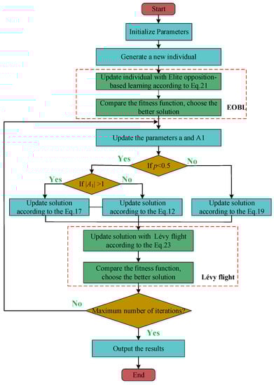 Elite opposition-based learning (EOBL) is an innovative approach in the field of computational intelligence, and it has been applied in many metaheuristic algorithms [,,]. An EOBL strategy is mainly used to improve the diversity of population by evaluating the fitness function of the current and opposition solutions, and then the better solutions are selected as the initial individual. The individual with the minimum value of fitness function is regarded as the elite individual in the population. The EOBL strategy can be expressed as follows []: