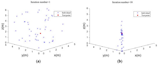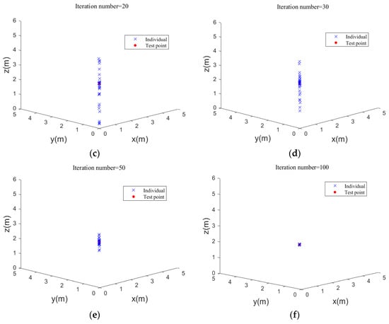 To prove the effectiveness of the IWOA, a single point (2.0, 2.0, 2.0) (m) was chosen for the simulation research. As shown in Figure 3, the red point is the test point, and the blue points are the individuals in the IWOA. At the initial moment, 50 individuals were randomly distributed in a space of 5 m × 5 m × 6 m, which facilitated the whale population to search for the global optimal solution quickly. With the increasing number of iterations, the scattered individuals moved closer to the test point, and all the individuals converged to the test point at 100 iterations. At this time, the value of the fitness function was 2.7701 × 10−9, the positioning error of 2.34 cm was achieved, and the final estimated location was (2.0086, 2.0041, 2.0214) (m), indicating that the IWOA had high positioning precision.