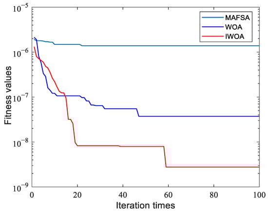 To further demonstrate the effectiveness of the proposed algorithm, IWOA, WOA [], and MAFSA [] were simulated in this paper. Simulations were performed for the algorithms under the same conditions. The convergence curves of IWOA, WOA, and MAFSA are shown in Figure 4, indicating that the IWOA improved solution accuracy and was superior to the WOA and MAFSA.