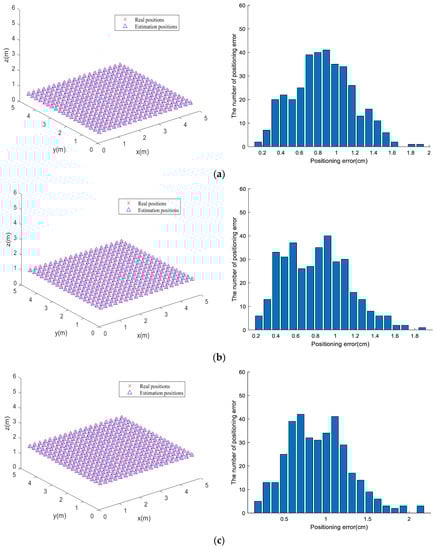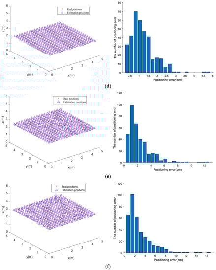 The PD was considered without any rotation angle for all test points, and the estimated positioning of each test point could be achieved by IWOA optimization. Owing to the randomization of the optimization algorithm searching, the optimization estimation for each test point was run 30 times independently to select the optimal results, and the positioning results at different heights were as shown in Figure 5, where the “×” and “△” symbols represent the real and estimated positions of the test point, respectively. It can be seen from Figure 5a–f that the estimated positions were located close to the real positions, demonstrating the positioning accuracy very well.