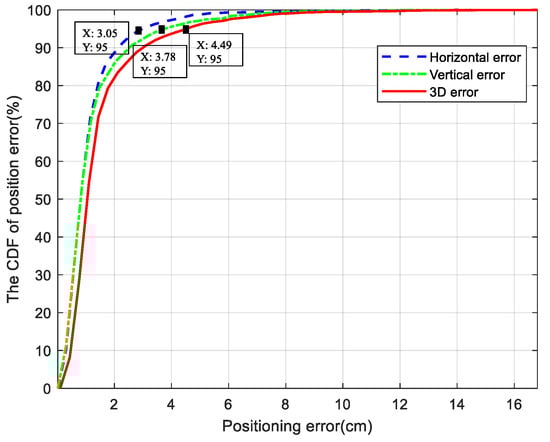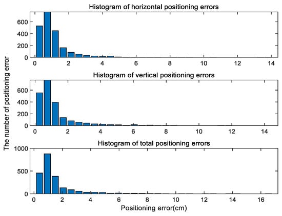 Histograms of the positioning errors with all test points are shown in Figure 6, and the CDF curves are shown in Figure 7. It can be seen from Figure 6 that the average error of 3D positioning was 2.14 cm, the maximum positioning error was 16.81 cm, and the minimum positioning error was 0.11 cm. As shown in Figure 7, if 95% of the test points were accepted, the 3D positioning error of the IWOA would be less than 4.49 cm, the horizontal positioning error would be less than 3.05 cm, and the vertical positioning error would be less than 3.78 cm.