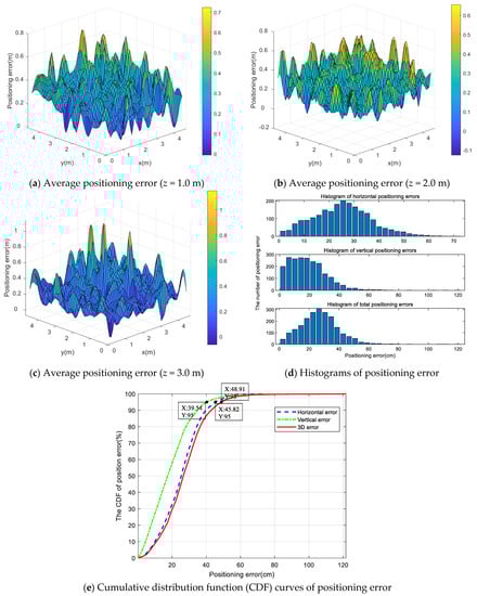 When the rotation angles along the X-axis, Y-axis, and Z-axis were within the ranges [0°, 10°], [0°, 10°], and [0°, 360°], respectively, the average error of 3D positioning was 7.85 cm when angle estimation was considered, as shown in Figure 9a–e. If 95% of the test points were accepted, a 3D positioning error less than 18.62 cm, a horizontal positioning error less than 16.08 cm, and a vertical positioning error less than 15.02 cm would be achieved by the IWOA algorithm. The results show that the IWOA, which took PD rotation angle estimation into account, could significantly improve 3D positioning accuracy.