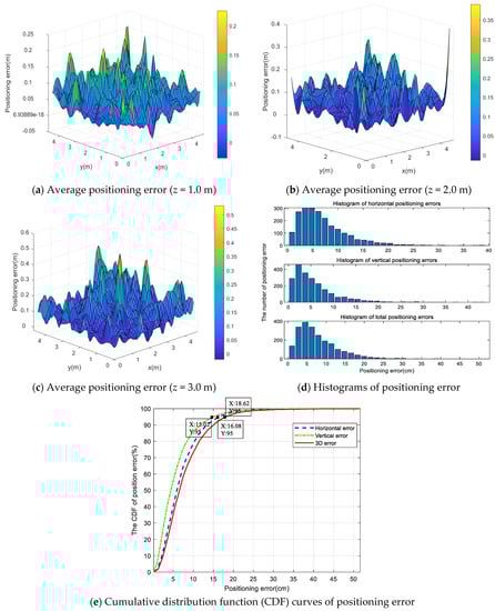 To assess the overall positioning performance of the IWOA, the test positions were placed at different heights, i.e., 0.5, 1.0, 1.5, 2.0, 2.5, and 3.0 m, and 2166 test points were generated in the space, the interval between them being 0.25 m in length and width. To effectively represent the optimization performance of the algorithm, the cumulative distribution function (CDF) of the positioning error was used, and the Euclidean distance was used to express the positioning error.
