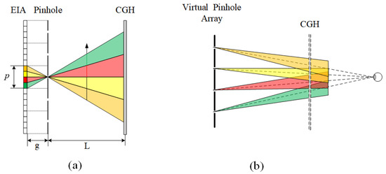 (a) Principle of recording stage of pinhole-type HS; (b) the observer’s eye samples one light ray from each virtual pinhole in the display stage of “pinhole mode”.