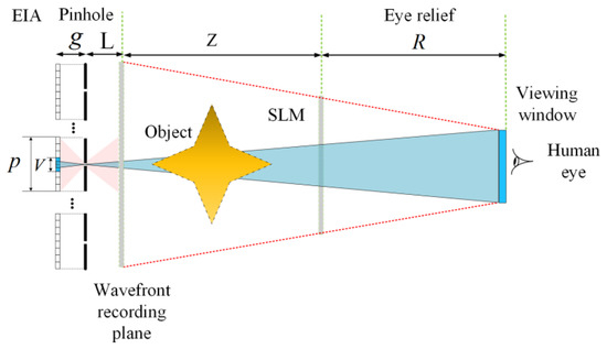 where g is the gap between the EIA and the pinhole array, L is the distance between the pinhole and the wavefront recording plane, Z is the distance between the wavefront recording plane and the SLM, R is the eye relief which means the distance between the SLM and the VW, V is the size of the visible region, and W is the size of VW. Thus, the ratio of the visible area to EI can be easily obtained: