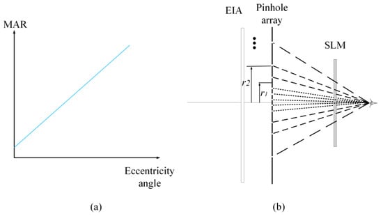 where ω is the MAR in degrees per cycle, e is the eccentricity angle, ω0 is the smallest resolvable angle and represents the reciprocal of visual acuity at the fovea (e = 0), and m is the MAR slope. Equation (5) can be depicted by the blue line in Figure 4a, which denotes the angular resolution linearly declining with the increasing visual eccentricity.