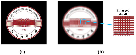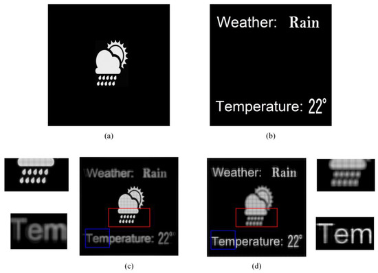 We further demonstrated the proposed methods of a 3D object. For simplicity, we set a 3D scene containing two images at different planes, as Figure 10a,b show. These two planes were set −2 mm and 2 mm distant from the pinhole plane. Figure 10c,d show the reconstructed images of the conventional pinhole-type HS focus on the pattern and letters, respectively. Figure 11 shows the reconstructed results of the proposed visible pixels method. The reconstructed results were basically consistent with the traditional method, the difference was that because the proposed method reduced the beam width, similar to the Maxwellian-type holographic display [30,31], the depth-of-field range of each layer was increased. This can be easily confirmed from the enlarged details of the red boxes and the blue boxes. Figure 12 shows the reconstructed results of the foveated region rendering method. We set the second layer of the letters as the peripheral region. From the enlarged details in Figure 12, the quality of the central pattern remained unchanged and the image quality of the peripheral letters was slightly decreased. The simulations prove that the proposed methods are effective for 3D objects. It is worth noting that no matter how many layers there are in a 3D scene, the calculation amount of the proposed methods is the same, since the computational complexity is only related to the total number of pixels that need to be calculated on the captured EIA.