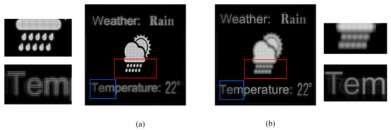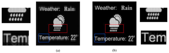 The reconstructed images of the proposed foveated region rendering method focus on the (a) pattern and (b) letters.