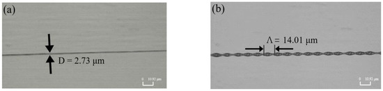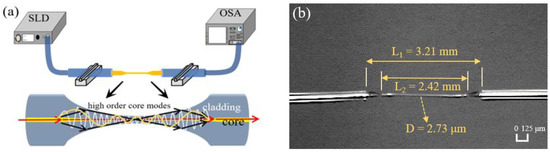 Over the past few decades, fiber interferometers have been recognized as powerful tools for precisely measuring physical, chemical, or biological parameters in many scientific and industrial applications. Among those fiber interferometers, modal interferometers with high sensitivity have been widely employed for optical imaging and sensing systems [1,2,3]. However, the long-term environment and temperature stability are always important issues to be addressed and compensated for. Conveniently, fiber gratings, including the Bragg, long-period, phase-shifted, blazed, superstructure, rocking, and chiral gratings [4,5,6,7,8,9,10], inscribed in the core or corrugated on the surface of the single-mode fibers (SMF), are another kind of successful interferometer and are more intensively used due to their great precision and high stability. Originally, the fiber Bragg gratings used in such work were made by creating longitudinal standing waves in a Ge-doped SMF over several hours using an Ar ion laser [11,12,13]. Therefore, high system stability of the experimental set-up needed was stringent for good interference effects to be seen. In addition, various kinds of fabrication methods such as dual-beam interference, femtosecond point-by-point writing, chemical etching, phase mask exposure, mechanical pressing, ion beam milling [14,15,16,17,18,19], and so on have been used in the fabrication of various kinds of fiber gratings since then. To date, the most successful and mature fabrication methods for fiber gratings are based on exploiting the fiber photosensitivity [20,21] where light from a 248 nm excimer laser or a 244 nm frequency-doubled laser is used to break the covalent bonds between the germanium and oxygen atoms in the fiber core. The vacancy of the missing electron, forming a color center absorber, induces the periodical changes of the refractive index seen along the Ge-doped fiber core [22,23]. However, this method is not suitable for those special fibers, such as no-core fibers and phosphate glass fibers, which have a lack of photosensitivity (such as the no-core fiber or silica micro-/nano-tapered fibers) and are becoming more and more important for key applications in micro- or nano-photonics. Instead, the femtosecond laser writing, chemical etching, or ion beam milling methods available could be used as alternative fabrication methods to create periodical index variations in micro-tapered fibers [24,25,26,27]. Nevertheless, the key trade-off issue here is that the mechanical strength is significantly weakened, and this is the effect which is often seen to sacrifice the long-term stability of the devices created in this way.
