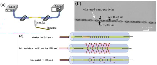 In the fabrication process developed and used, a segment of the SMF was uncoated and then placed and fixed on the fiber taper station, shown in Figure 1a. Broadband white-light (covering the spectral region from 1250–1650 nm, from a superluminescent diode (SLD)) was launched into the fiber, with an Optical Spectrum Analyzer (OSA) used at the other end to measure the spectral response achieved. A micro-hydrogen flame torch was applied to heat the fiber locally, allowing it to be tapered rapidly, to create an abrupt taper, shown in Figure 1b. The L1 and L2 are the total lengths of the abrupt taper and the uniformed taper, respectively. The half difference, (L1-L2)/2 = 0.395 mm, is the length of one abrupt taper transition. The fiber diameter decreased from 125 μm to the tapered diameter, D, of 2.73 μm, within a very short distance, which, thus, obviously breaks the waveguide adiabaticity to excite the HOCMs. Subsequently, another torch, with a wider flame diameter of 9 mm, was used to heat the abrupt taper point, back and forth, to lead to a longer uniformed tapered length, until an average value of D of 2.73 μm was reached, as shown in Figure 1b. The uniformed tapered region in this work was defined as the region with a diameter tolerance ±0.1 μm under a 1000× CCD microscope. From this figure, it can be seen that the shape of the taper transition changed very quickly at the bilateral ends of the uniformed taper. Since the AT can excite HOCMs due to the rapid changes in D, the elongated uniformed taper, 2.42 mm in length, can help further induce larger values of OPD for good interference due to the higher index difference between the HOCMs. However, the HOCMs are all guided to propagate in the silica tapered fiber, one in which the original fiber cladding and air in the un-tapered fiber turn out to be the new guiding core and new cladding, respectively. In principle, by applying a thin layer of the high-index material over the evanescent field of the tapered fiber, the OPD between the higher- and lower-order core modes can, thus, be increased. This occurs because the penetration depth of the evanescent fields for the HOCMs can be extended further away from the lower-order modes. Interestingly, when the high-index thin overlay on the tapered fiber is periodically distributed, the spectral responses for this interferometer will be different. First, the high-index overlay can reduce the number of resonances by attenuating some unwanted HOCMs, which then increases the value of the FSR. Second, the ER used for interference effects to be seen can be significantly improved using the most suitable ranges of overlay thickness. To achieve the periodically distributed high-index thin overlay on the tapered fibers, a new fabrication method has been proposed in this work. A large amount of the positively charged nano-particles are generated from combustion using the fumes, the so-called ‘incenses’ which are a major ingredient of the wood tar. At temperatures > 82 °C, this material ‘flows’ and becomes steamed when the temperature is >405 °C. Under typical conditions, the combustion temperature when using such incense is usually far beyond 400 °C. Thus, the wood tar molecules were steamed from the beginning and then liquefied when arriving at the tapered fiber surface, at a position 1.5 cm above the combustion source, as shown schematically in Figure 2a. For the steamed molecules, the molecules are ionized to be in a plasma phase. Since the electrons are much lighter than the particles in the air, the electrons rapidly escape and disappear. The remaining particles are heavier and, thus, positively charged. They rise with the hot air flow, to reach the tapered fiber surface. Owing to the static charges, the charged liquefied wood tar molecules strongly repel each other to become periodically distributed, as shown in Figure 2b. More and more charged molecules coming from the rising smoke arrive to join the existing molecules, which allow the clustered molecules to keep growing in size, as well as the value of Λ of the distributed molecules increasing before saturation occurs. By selecting the most suitable parameters for making the SAFG, the quasi-periodic gratings created can be used to serve as fiber gratings. In Figure 2c, it is indicated that a value of Λ corresponding to the short-, intermediate-, and long-period gratings are roughly categorized into the following groups: <1 μm, between 1–100 μm, and >100 μm, respectively. The short-period grating, also called a Bragg grating, has a grating vector in an inverse way with respect to the lightwave propagation direction, to reflect backward the phase-matching wavelength, namely the Bragg wavelengths. In contrast, the long-period grating can couple the phase-matching wavelengths to forward propagate in the cladding. When the value of Λ is located somewhere between the short and long period, this intermediate-period grating can scatter the light used radially [32]. Therefore, in contrast to the conventional fiber long-period gratings or Bragg gratings which are most familiar, this SAFG has a value of Λ at ~14 μm, which would lead to the effect of scattering and attenuating certain HOCMs. This intermediate period of a surface-corrugated fiber grating [32] incorporated into a compact few-mode fiber interferometer can be used to efficiently increase the ER over a short length (< 3.2 mm) footprint, ascribed to the higher index of the wood tar molecules which are in a periodical distribution on the tapered fibers.