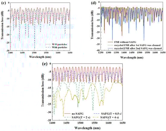 Microphotographs of the (a) tapered fiber and (b) SAFG-incorporated FMI under the 1000× CCD microscope. Spectral responses of the (c) FMI versus SAFG-incorporated FMI and (d) the repeatability for the SAFG-incorporated FMI using alcohol spray. (e) Spectral evolutions during the SAFG formation at different elapsed time, T.