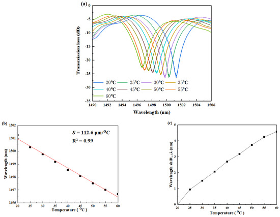 To investigate the potential applications of the grating created in temperature sensing, sample B with a D = 3.5 μm, was used. Sample B was placed inside a temperature controlled cavity, having a temperature resolution of 0.1 °C. The sample B used had a SAFG period of ~13 μm and the heating temperature was controlled over a range from 20 °C to 60 °C (with an increment of 5 °C) in the experiment carried out. As mentioned above, the carbon compounds present with the major materials containing wood tar and the SAFG can be stabilized at the temperature below 82 °C. However, for temperature sensing measurements, the heating time in the oven is approximately 20 min for stabilization and accuracy. However, it was observed that the spectral responses start to become unstable when the heating temperature is above 65 °C for over 20 min. In fact, the heating temperature should always be below 82 °C to prevent serious SAFG deformation. However, when the heating temperature is increased to 65 °C, some ingredients of the carbon compounds leak out to lead to index instability or slight structure deformation that cannot be observed by naked eyes. Thus, the temperature sensing is carried out between 20 and 60 °C in this work. Some pure chemicals with higher softening temperatures could be useful to improve the temperature sensing range in future works. In addition, the grating pitch can be determined by changing the heating temperature of the smoke or the distance between the tapered fiber and the smoking source to change the viscosity of the clustered particles on tapered fibers. In addition, the grating pitch can also be affected by the adhesion between the tapered fiber and the cluster particles and the tapered fiber diameter. In our experiments, it was found that a smaller tapered diameter can normally lead to a somehow shorter grating pitch. However, this is a complicated process due to several issues including the temperature and ingredients of the smoking particles, the distance between the tapered fiber and the smoking source, the tapered diameter, and the adhesion between the tapered fiber and the clustered particles. Obviously, the temperature and the viscosity dominate the issue of determining the grating pitch. Figure 4a shows the spectral responses achieved from the investigation, under different heating temperatures being used. The calibration for the device can be seen in Figure 4. The resonant wavelength blue-shift seen with increasing temperature was as shown in Figure 4b. From this figure, the temperature sensitivity, S, can be deduced to be 112.6 pm/°C, an important result, and which is at least twice that seen with other kinds of temperature sensors using special fibers or interferometers [34,35,36]. Further confidence is given in the result in that the coefficient of determination, R2 is 0.99, which reveals the high linearity of the wavelength shift, Δλ, achieved as a function of the temperature variations in the test oven. The relationship between the value of Δλ and the temperature can be seen more clearly in Figure 4c. In short, the merits of this temperature sensor include the following points: (1) a new fabrication technique to make fiber gratings on micro-tapered fiber based on the self-assembly particles in quasi-periodic distributions, (2) a temperature sensitivity of up to 112.6 pm/°C which is higher than those SMS (single-mode/multi-mode/single mode)-based temperature sensors [37], and (3) a compact fiber sensor with a footprint of less than 4 mm (total length of the interferometer is 3.21 mm).