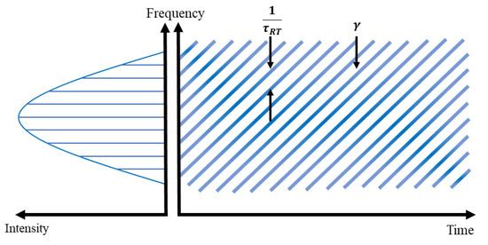 An FSF laser has an acousto-optic modulator (AOM), which is an optical frequency shifter, incorporated in its laser cavity such that the intracavity field frequency is shifted by a fixed amount at every round trip transit. Figure 1 presents a schematic of a chirped comb of an FSF laser. Instantaneous frequencies are present at each cavity longitudinal mode frequency interval. The left side is the light intensity and shows the oscillation spectrum. The right side shows the time variation of the instantaneous frequency with a slope γ and 1/ τ R T is the cavity free spectral range (FSR). These are present in a comb-like pattern for each free spectral width. γ is also the chirp rate (frequency sweep speed), typically several PHz/s, which is very fast [18].