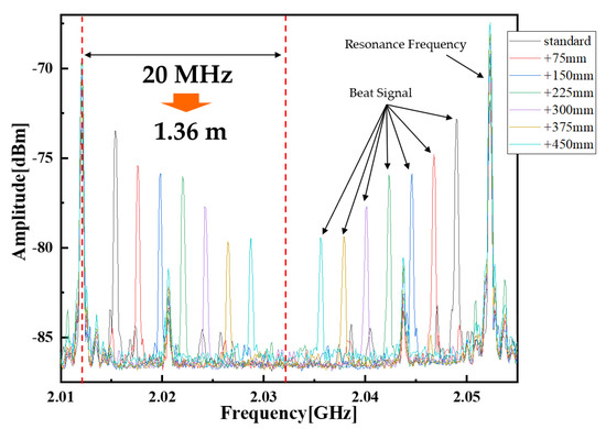 Figure 8 presents the results when we generated a beat signal with OFDR using FS-THz waves. The movable mirror was moved every 75 mm. Higher-order beat signals appeared in the 2 GHz band range. In the OFDR measurement using FS-THz waves, a beat signal is generated between the resonance frequencies, depending on the optical path difference. The FSF laser used as the pump light source had a resonant frequency of 40 MHz, i.e., there was a resonant frequency every 40 MHz. The spectrum at both ends of Figure 8 coincides with the resonance frequencies and the spectrum of the beat signal every 75 mm optical path difference appears between these resonance frequencies. At the frequency corresponding to the strongest beat signal, the signal-to-noise ratio was ~17 dB, which was the limit of the beat signal strength of the FSF laser itself. In addition, the THz waves collimating beam had a little spread. This beam spreading appeared as a loss; therefore, the signal intensity decreased by increasing the optical path length difference. We also moved the movable mirror every 75 mm to check the frequency variation of the beat signal. The difference between individual beat frequencies was approximately 2.2 MHz, as shown in Figure 8. The theoretical value was 1.1 MHz when the optical path difference of 75 mm is converted to a frequency, but it was 2.2 MHz because the optical path was round-trip. In terms of the optical path length, we were able to continuously measure a change in the optical path length of approximately 1.36 m. At this time, the light source and the detection unit were not adjusted at all. Thus, detection was possible without adjustment, no matter where the reflection point was in the distance measurement range of approximately 1.5 m. The measurement accuracy of FS-THz waves depends on the measurement accuracy of the FSF laser and is be expressed as