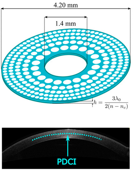 Another important parameter that should be taken into account in the design of CIs is their thickness because, on the one hand, a CI of a few microns facilitates the flow of nutrients through the inlay and minimizes the risk of corneal inflammation; however, a very thin CI could be difficult to manufacture and to handle (the Kamra® inlay is one example). On the other hand, a thick DCI such as the one here proposed will be more robust and reduce possible thickness errors in manufacturing. However, the risk of inducing corneal thickness variations and epithelial decompensation must be evaluated.