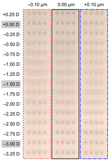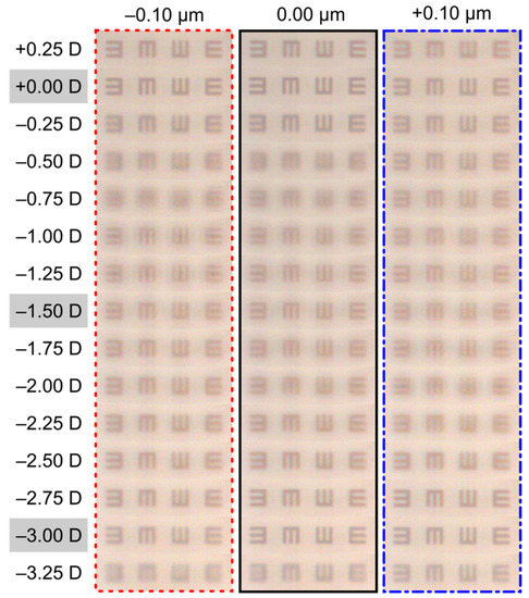 In order to evaluate the manufacturing tolerance to deviations from the ideal thickness of 10.5 µm, the TF-MTFs results for two PDCIs with a difference of ±1.0 µm thickness are shown in Figure 5. Note that in both cases, the trifocal profile is preserved. For the PDCI of thickness h = 9.5 µm, the visibility of the letters is very similar for all three foci (dotted line). For the PDCI of thickness h = 11.5 µm, the intermediate focus improves with respect to the other two foci (continuous green line). Figure 6 shows the images captured at the foci (far, intermediate and near) of tumbling E’s, corresponding to 0.0 logMAR, 0.2 logMAR and 0.4 logMAR. It can be seen that the results of the TF-MTFs and the images at the foci are highly correlated.