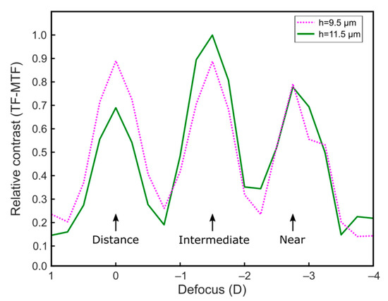 The through-focus modulation transfer function (TF-MTF) was measured as the relative contrast of the images of a sinusoidal grating [31]. These images were virtually located at different vergences, in the range +1.00 D to −4.00 D, separated by 0.25 D. A pupil diameter of 4.5 mm was considered.