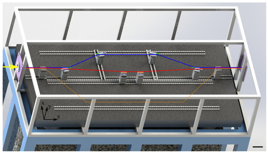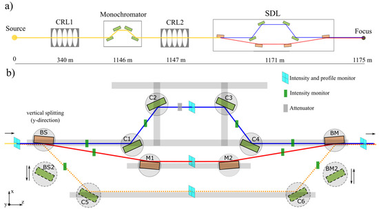 Due to the difficulty in the fabrication of high-quality thin crystals, and the thermal deformation at high heat load [8], the hybrid SDL uses the wavefront splitting scheme to split the beam. As shown in Figure 1b, the entire system lies horizontally on an optical table (the x–z plane). The multilayer beam splitter (BS) splits the XFEL pulses vertically into two sub-pulses (in the y-direction). For this purpose, the effective part of the BS and BM are half as tall as that of the others. After BM, the sub-pulses travel either via the first branch composed of 4 silicon crystals (C1–C4) or the second branch composed of two multilayers (M1–M2). Their path length can be varied by sliding the stages (circular region) along the guide rails (shadowed paths), or by moving the stages via their x- and z-freedom. Eventually, the sub-pulses are merged by the multilayer beam merger (BM).