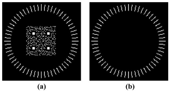 Figure 3 is the intensity pattern of the signal light pattern and the reference light pattern, in which the illumination was spatially coherent. The outside pattern was the reference light as shown in Figure 3b, for which the radial line reference pattern was used [35], and the inner pattern was the signal data page, which had 12 symbols in both the length and width directions and contained four sync marks for location [36]. The wavelength of the light for writing was 532 nm, the pixel pitch of the SLM was 13.7 μm and the original focal length for the achromatic objective lens was 5 mm. Furthermore, the diffracted light from each single pixel in the SLM was in the Fraunhofer region directly in front of the lens [35]. The thickness of the medium was 1 mm, the PQ-PMMA photopolymer was used as the recording medium, the refractive index of the medium was 1.5 and the spatial modulation of the refractive index was 1 × 10−4.