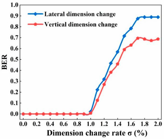 In order to prove the effectiveness of the compensation method, we made an effort to compensate for the conditions when σL and σV were as high as 1.5%, where the BER for the lateral dimension change increased to 0.7153, and the BER for the vertical dimension change was 0.5417.