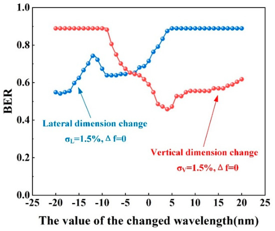 Firstly, the compensation that only utilized the wavelength adjustment was implemented, and Figure 5 depicts the results for the lateral dimension change condition and the vertical dimension change condition. Although there was a large adjustment range for decreasing or increasing the wavelength (i.e., Δλ∈[−20, 20] nm, where the wavelength interval was 1 nm, and each wavelength comes from a narrow-band laser), the BER did not reach zero for either kind of dimension change condition, and the BER was not significantly reduced. Under the lateral dimension change condition, the minimum BER only decreased to 0.5903, though the wavelength needed to be decreased by 19 nm, which we attempted to no avail. Then, under the vertical dimension change condition, the minimum BER decreased to 0.4583 while the wavelength only increased by 4 nm.