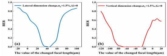 Secondly, the compensation based on changing the focal length of the objective lens was implemented as a comparison, and the results shown in Figure 6 indicate that the compensation effect was better than that of the former wavelength compensation method, and the BER was reduced to zero both for the lateral dimension change condition and the vertical dimension change condition. As can be seen from Figure 6, the focal length range of zero BER for the vertical dimension change condition (i.e., (65, 25) μm, about 40 μm) was larger than that of the lateral dimension change condition (i.e., (40, 45) μm, about 5 μm), which means it would be easier to adjust to zero BER for the vertical dimension change condition. From the results in Figure 5 and Figure 6, it can be deduced that the compensation for the lateral dimension change condition would be more difficult to achieve than for the vertical dimension change condition if they were to confront the same σ value.
