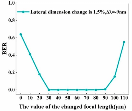 As shown in Figure 6a, the focal length adjustment range for reducing the BER to zero was narrow for the lateral dimension change condition. In order to widen the focal length adjustment range for compensation, the combination compensation method of simultaneously adjusting the focal length and the wavelength was introduced. Considering the lateral dimension change curve in Figure 5, when the wavelength decreased by 9 nm (i.e., −9 nm), though it did not achieve the smallest BER value, it still corresponded to the local minimum value, 0.6389; thus, the focal length adjustment was implemented and analyzed under the condition that the wavelength was decreased by 9 nm, and Figure 7 shows the results of this combination compensation method for the lateral dimension change condition. It can be observed that on the basis of the wavelength adjustment, the corresponding focal length adjustment range for compensation was (30, 80) μm, and the range width was 10 times that shown in Figure 6a. It needs to be clarified that the focal length change with the wavelength change induced by dispersion was not considered in the simulations, as such a focal length change would be too small to be considered if an achromatic lens were to be used, since the wavelength change would only be tens of nanometers.
