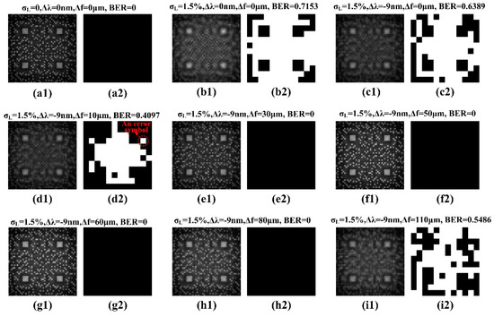In order to directly observe and analyze the reconstructed signal patterns related to the results in Figure 7, Figure 8(c1–i1) show the reconstructed signal patterns with focal length changes Δf = 0 μm, 10 μm, 30 μm, 50 μm, 60 μm, 80 μm and 110 μm, respectively, while the wavelength of the reading light was reduced by 9 nm. In comparison, Figure 8(a1,b1) show the reconstructed diagrams without any compensation under σL = 0 and 1.5%, respectively. The pictures denoted as Figure 8(a2–c2), etc., immediately to the right of the reconstructed patterns, are the corresponding symbol error diagrams. In these diagrams, each of the tiny bright squares, denoted as ‘An error symbol’ in Figure 8(d2), represents error within the symbol located there, and the bright space is the composition of these error symbols. The compensation results in Figure 8e–h directly show the effectiveness of this combination compensation method.