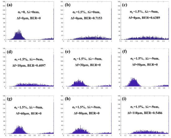 The normalized pixel intensity histogram was used to analyze the reconstructed signal pattern, as shown in Figure 9, where the abscissa represents the normalized intensity of each pixel, and the vertical axis represents the quantity of the pixels with a certain intensity. Figure 9a corresponds to the reconstructed signal pattern in Figure 8(a1), which is the original one without any dimension change of the medium. It can be observed from Figure 9a that the intensities of the ‘bright pixels’ were mainly distributed within the abscissa value within (0.8, 1), while the intensities of the ‘dark pixels’ were mainly distributed within (0, 0.4), and there was no overlapping between the dark and the bright pixels along the abscissa, which means the dark and the bright spots can be clearly distinguished. However, when the dimension change occurred in the material with σL = 1.5%, the intensity distribution of the dark and the bright pixels became consecutive, as shown in Figure 9b. In Figure 9c,d,i, when the wavelength decreased by 9 nm, the focal length was not sufficient to ensure an effective compensation. When the focal length adjustment increased to the range of (30, 80) µm, as shown in Figure 9e–h, the dark and the bright pixels were separated again without overlapping along the abscissa. The results also suggest that the combination compensation method of the focal length and the wavelength adjustments can maintain a BER of 0 in a larger selection range of focal length.