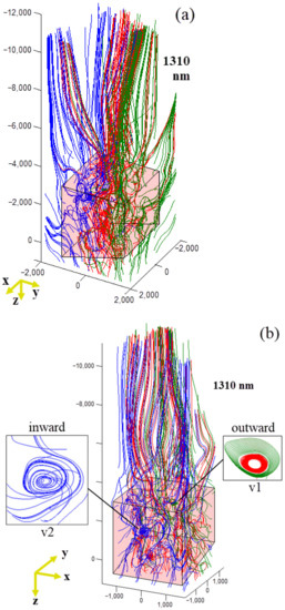 Overview (a) and the rotated view (b) of 3D Poynting vector distribution for the model of 1310 nm irradiation with the colour codes of streamlines: blue lines for long-base section (−y direction), red lines for middle section (around 0 position on y axis), and green lines for short-base section (+y direction). Insets in (b): Outward vortex v1 and Inward vortex v2.