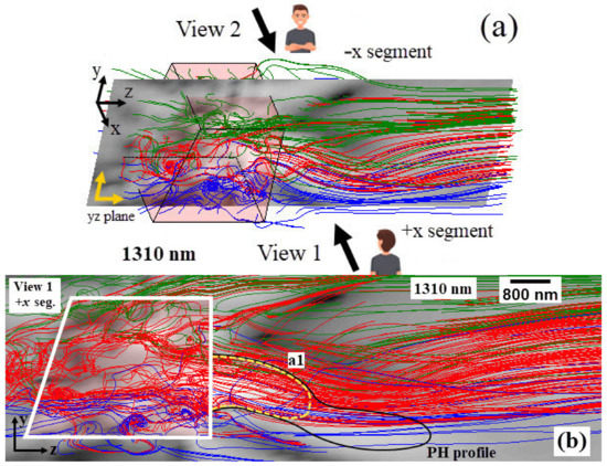 Overview (a) and the rotated view (b) of 3D Poynting vector distribution for the model of 1550 nm irradiation with the colour codes of streamlines: blue lines for long-base section (−y direction), red lines for middle section (around 0 position on y axis), and green lines for short-base section (+y direction).