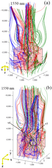 Figure 5a,b illustrate the overview and close-up views of 3D Poynting vector distribution for the model of 1550-nm-wavelength irradiation. Compared to the distributions for the model of 1310-nm-wavelength irradiation shown in Figure 3, the Poynting vector streamlines in Figure 5 are less swirling in the trapezoid particle and more straight in the volume of the generated photonic hook, which reflects a smaller number of vortexes shown in Figure 5. Two key vortexes, v5 and v6, are indicated in Figure 5 as well. The photonic hook of the irradiation at a longer wavelength of 1550 nm appears in the region with the maximum density of Poynting vector streamlines, basically filling the central volume of the modelling space. These features are in accordance with the 2D Poynting distribution on the median yz plane for the same model shown in Figure 2d, which induces an almost straight, slightly upward photonic hook. Therefore, it is noted that the difference of spatial location of Poynting vector vortexes crucially influence the bending direction of the generated photonic hook and vary the subsequent propagation routes for the lights (optical signals) with similar wavelengths. This effect can be only represented by 3D Poynting vector distributions [32] and cause multiple localised high-magnitude regions of Poynting vectors to constitute a complete single photonic hook.