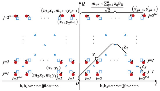 Firstly, we derive the BER expression of bits for user 1. Due to the symmetry of the adjusted SC, the BER of for user 1 in the first quadrant is the same as that in the rest three quadrants. Since the detection of for user 1 in the vertical direction follows the same principle as that of in the horizontal direction, we have . As shown in Figure 2, each quadrant of the SC can be divided into columns. The BER for the in-phase components of the points in each column are the same, while the BERs for the in-phase components in various columns are different from each other. Thus, the BER expression is as follows: