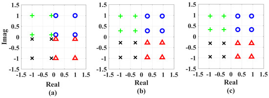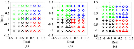 The SCs of (a) the no adjustment scheme, (b) the SC-A scheme and (c) the SC-SIC-A scheme. The parameters of (b,c) are obtained, when and . Colours are used to distinguish the data of user 1, and markers are used to distinguish the data of user 2 when user 1’s data are detected.