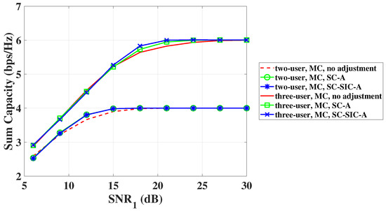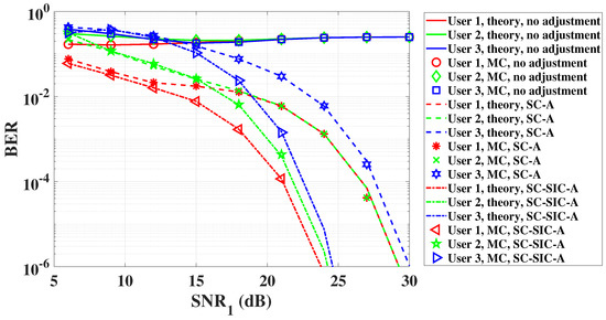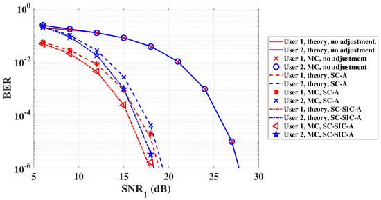 The BER performance is shown in Figure 4, where the results of theoretical analysis and MC simulation match very well. Note that under the no adjustment scheme, user 1 and user 2 can achieve the BER of when is 23.9 dB, for which its corresponding BER curves basically coincide. Under the SC-A scheme, to achieve BER of decreases from 23.9 dB to 14.8 dB for user 1, and the value of to achieve BER of decreases from 23.9 dB to 15.7 dB for user 2 at the same time. Under the proposed SC-SIC-A scheme in Figure 1, the obtained vectors of optimal adjustment parameters are and , when is 21 dB. With and , the equality in (C1) holds, and is smaller than and very close to 1. Moreover, we can see that the optimal power allocation coefficients for SIC decoding are different from the original power allocation coefficients . The values of to achieve the BER of are 13.5 dB and 14.9 dB for the two users, respectively. Compared with the no adjustment scheme, the corresponding reductions in to achieve the BER of are 9.1 dB and 8.2 dB for the two users, respectively. Meanwhile, the corresponding reductions in to achieve the same level of BER are 1.3 dB and 0.8 dB, respectively, compared with the SC-A scheme.
