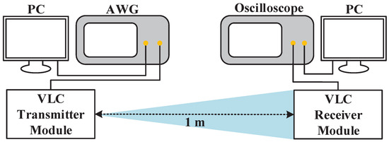 The experimental setup of the NOMA VLC system is shown in Figure 8. The two users’ 4-QAM data are generated offline using MATLAB in personal computer (PC). The two 4-QAM data with particular power allocation coefficient are superposed to generate a frequency-domain NOMA signal, which is converted to the time-domain OFDM signal, after passing through 64-point IFFT module. Note that Hermitian symmetry is used to the generate real-valued OFDM signal. Two thousand OFDM signals were uploaded to the arbitrary waveform generator (AWG) (RIGOL DG1062Z) with a sampling rate of 10 MSa/s. Subsequently, the signal generated by AWG drives the VLC transmitter module (HCCLS2021MOD01-TX), which converts the electrical signal into modulated light. After 1 m propagation, the modulated light reaches the VLC receiver module (HCCLS2021MOD01-RX), which converts it back to electrical signals. The converted electrical signal is captured by the oscilloscope (ROHDE&SCHWARZ RTE1022) and is downloaded to the PC for offline processing.