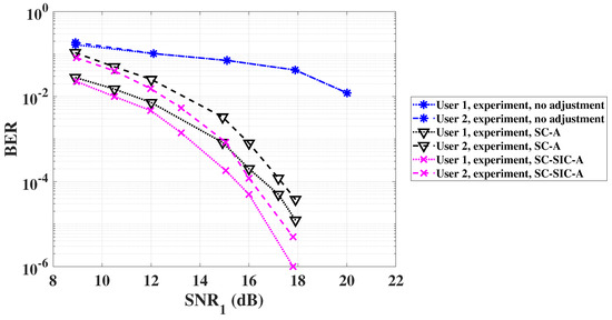 where is the error probability of for user 2 at the adjusted SC point , represents user 1 and stands for the detection result of user 1’s bit. The index represents the conditions that ’s bits are detected correctly and wrongly, respectively. Thus, the BER expression of user 2 in Equation (10) can be written as follows: