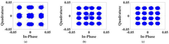 The SCs of the three-user NOMA VLC system obtained by experiment, when dB. (a) No adjustment scheme; (b) SC-A scheme; (c) SC-SIC-A scheme.