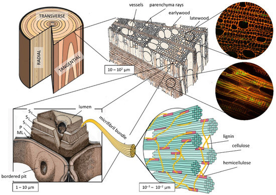 Wood sections at the macroscale (top left); schematic microstructure of hardwood species (top middle) with NLO images (diameter = 200 µm) of the microstructure of poplar xylem in transverse and radial sections (top right). Schematic representation of cell wall layers—ML, middle lamella; P, primary cell wall; S1, S2, and S3, sublayers of secondary cell wall (bottom left); close up of a microfibril bundle from S2 showing individual crystallites of cellulose glued together by the interfibrillar compounds of hemicellulose and lignin (bottom right).