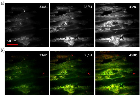 (a) Poplar greyscale NLO microscopy images (200 × 200 μm2) and (b) corresponding TPEF/SHG merged images acquired at different depths inside the wood slice (tangential section), highlighting the presence of SHG emitters. Depths of recording from the sample’s surface are indicated in the top right corner (81 μm scanning depth; 1 μm sampling step).